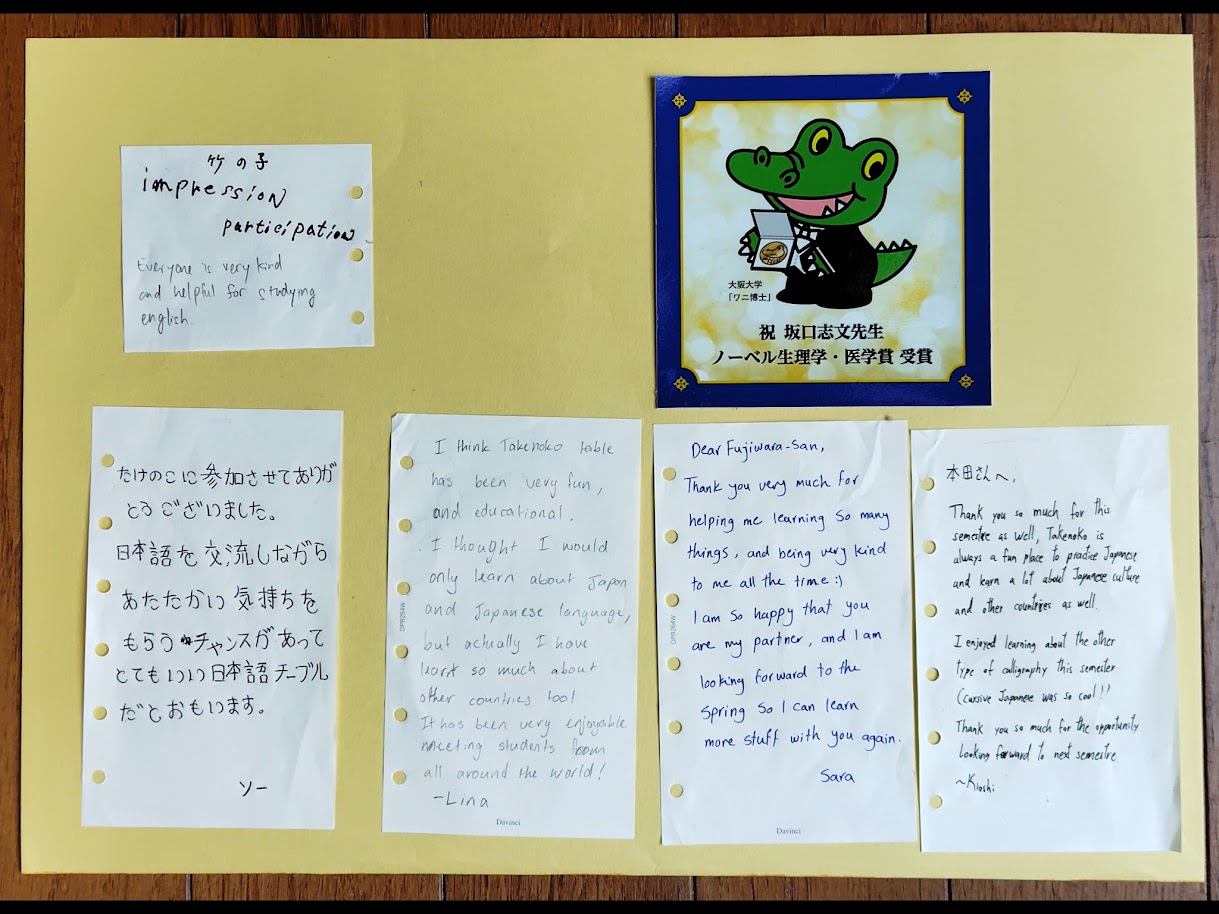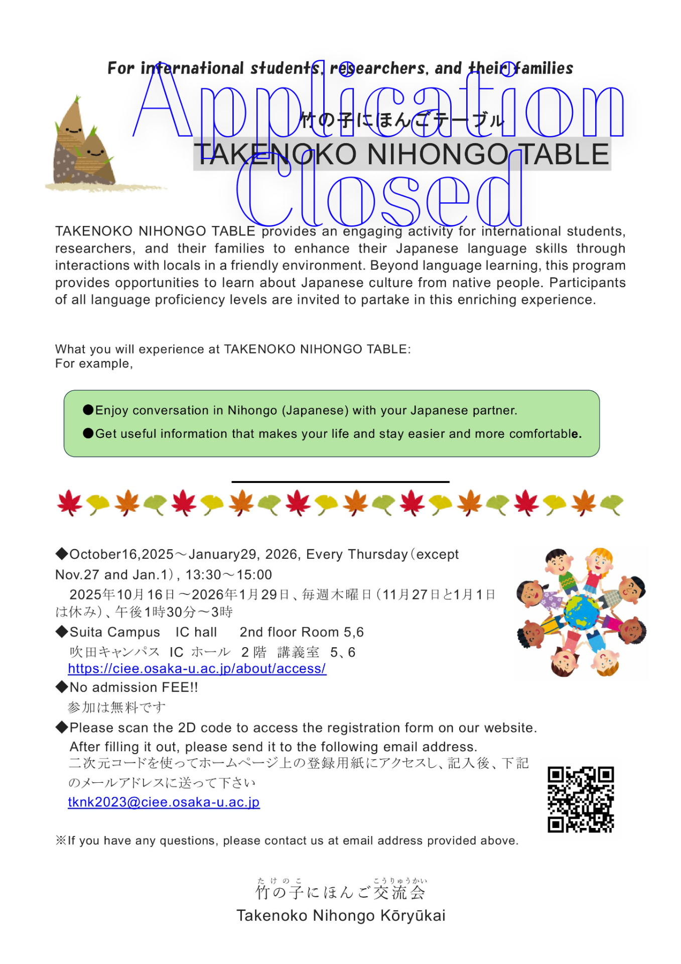 竹の子にほんご交流会は、日本語学習支援を主な活動として、大阪大学の留学生・外国人研究者やその家族と交流する会です。大阪大学 吹田キャンパスの ICホール(Intercultural Collaboration Hall) 2 階 の大阪大学国際教育交流センター(Center for International Education and Exchange of Osaka University) を拠点に、ボランティアのパートナーと日本語で語り合う「にほんごテーブル」を開いています。